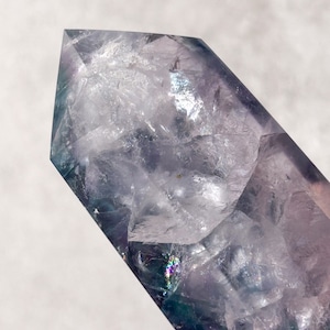 パープルとグリーンが美しい模様を描いているザクザクのフローライトダブルポイント。