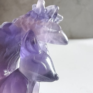 落ち着いた紫を基調とした、フローライトの狐カービング。