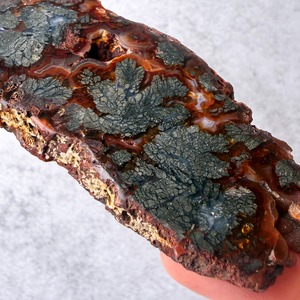 赤褐色の中に、金属的な質感を帯びた模様が広がるマーカサイトアゲートのスラブです。