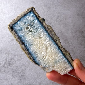 淡いブルーの縁取りと、内側に広がる白い結晶質の表情が印象的なアゲートスラブです。