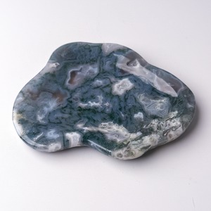 深いグリーンの中に、苔のような模様が静かに広がるモスアゲートプレート。