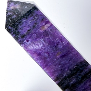 紫の濃淡と独特のテクスチャーが美しく、存在感のあるチャロアイトタワーです。