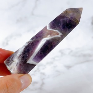 紫色のアメジストとミルキークォーツが重なり合い、縞模様が特徴的なクリスタルです。