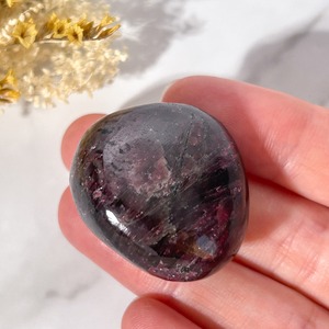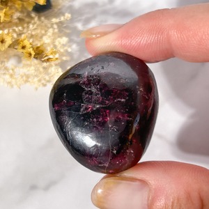 ガーネットのタンブルです。光が当たるとピンク、パープル、ブルーカラーに美しく輝きます。透明感のある結晶の奥には赤い輝きがここぞとばかりに輝いています。