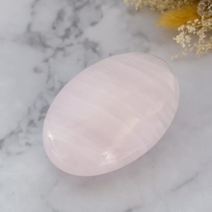 柔らかいベビーピンクにホワイトの斜に流れるストライプが美しく、手にしっくりと優しいパームストーンです。ぷっくりとした形も可愛らしいです。