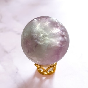 美しいレインボーがたくさん入った、パープルとグリーンのフローライトスフィアです。透明感も素敵です。