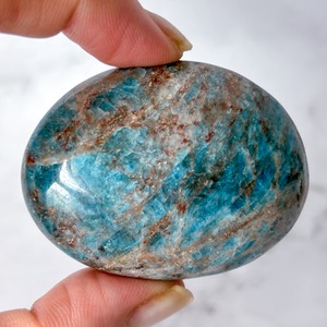 デニムのような落ち着いたブルーと、ブラウンのコントラストが美しい、ブルーアパタイトのパームストーンです。ぷっくりとした厚みのある形も可愛いです。シャリシャリの奥行感が美しく、奥の方にシラーのような輝きを見せています。